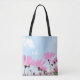 Flores rosas Flores Florales Mamá nombran la bolsa del día de la madre. Bolsa de teta floral personalizado con nombre. El texto está en un fondo de color negro con flores rosas y cielo azul.