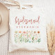 Esta sencilla y elegante bolsa tote presenta un borde de flores silvestres en tonos de rosa y melocotón con tallos verdes. La palabra "dama de honor" aparece en escritura a mano en rosa polvoriento. Personalízala con su nombre en fuente sans serif. ¡Hace un regalo perfecto para la dama de honor!