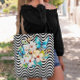 Flores y mariposa franjas onduladas negras y blancas en todo el bolso de tote impreso. El fondo de las rayas onduladas se parece al océano o al zigzag curvado o al arte de Chevron. Cambie el fondo de color y cambie las líneas onduladas negras por colores diferentes.