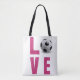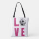 El diseño de las palabras de Love Soccer con letras brillantes de color rosa intenso y el "o" es reemplazado por una pelota de fútbol.
