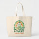 Saint Patrick's Day tote bag for teachers, telling the world—and more importantly, your students—what a lucky teacher you are with this teacher's St Patrick's Day t-tote bag personalized with the name of the school or the teacher's name. The print features a whimsical rainbow in orange, yellow, and green, a drawing of a pencil, a lucky horseshoe, patterned letters, and shamrocks.