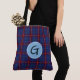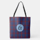 Bolsa de teta de yegua colorida hecha en el patrón tradicional tartán Glenn, azul, verde, rojo y negro. Una placa decorativa de texto redondo azul claro, en la parte delantera de la bolsa, tiene un monograma de una sola letra negro listo para personalizar. Gran tote para todos los propósitos.