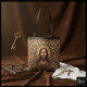 "This majestic and detailed graphic features a reverent portrait of Jesus Christ with soft, focused lighting and a gentle expression. The central image is magnificently framed by a rich, three-dimensional border of scrolling gold patterns and intricate floral motifs set against a deep navy blue or black background. This luxurious and detailed design is perfect for high-end religious home decor (such as art prints and posters), covers for deluxe prayer books or Bibles, celebratory greeting cards with a spiritual theme, commemorative medals or symbols, or any product intended to express faith and artistic appreciation with elegance and sophistication."