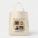 Celebrate Grandma with this beautiful personalized greeting tote bag featuring a custom photo collage, a delicate eucalyptus design and soft watercolor accents, framing four family photos. The loving message 'Grandma, we love you' makes it an unforgettable gift for birthdays, holidays, or just because. Customize with your favorite photos, names and your text on the backside for a truly unique gift.
