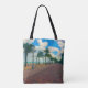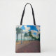 La fotografía original de ZoeSPEAK en esta bolsa de Tote es un paisaje del paseo marítimo a lo largo de la playa en Hollywood, Florida. El tiempo es frío y la brisa, la playa está vacía y a lo lejos sólo se puede ver a unas pocas personas en el paseo. Las palmeras se están alejando del agua y el cielo tropical azul está lleno de nubes blancas.