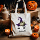 Esta bolsa de tote de Halloween tiene la cara de una bruja linda con un gorra morado adornado con flores blancas. Personalizar con su nombre en un tipo de letra de pincel de estilo manuscrito negro, o cambia a cualquier texto de su elección. ¡Perfecto para el truco o el trato!