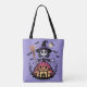 This Halloween Skeleton Witch Tote Bag showcases a charming skeleton witch with a pumpkin dress, broom, and bats, along with the text “Halloween Night” on a purple background. A stylish and practical accessory, perfect for carrying essentials while celebrating the spooky season.