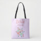 Esta hermosa bolsa tote floral morada y rosa es perfecta para la novia. Con un fondo de color lila, "Novia" está escrito en rosa seguido de su nombre en una plantilla. Un ramo floral rosa y azul está representado en la parte inferior. ¡Haga su pedido hoy!