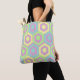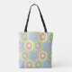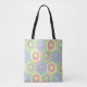 Esta bolsa de tote tiene un diseño geométrico de hexágonos en azul pálido, amarillo pálido y verde pálido sobre un campo de rayas en rosa pálido y púrpura pálido. Úsalo para sostener tus huevos durante tu caza de huevos de Pascua.