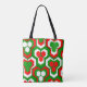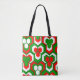 Esta bolsa de tote tiene un diseño geométrico Navidad de hexágonos en conjuntos de tres que parecen flores en rojo, blanco y verde.