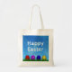 Feliz ilustracion de Pascua con coloridos huevos de Pascua pintados en el césped con el cielo azul en la parte trasera y la tipografía de "Feliz Pascua" escrita con nubes blancas.