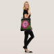 La imagen floral verde y rosa impresa en la bolsa de tote es de una foto de una creación crocheted original diseñada a mano y Copyright © del diseñador publicado Delores Chamblin. En la bolsa se reproduce la imagen de la flor artesanal única y de las hojas con puntos visibles y botón de perla.