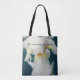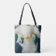 Bolsa de la Tote con temática floral que presenta una foto de un gran iris blanco después de la lluvia.