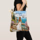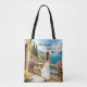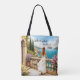 Tote bag featuring a painting of an elegant lady on an Italian balcony overlooking a pretty Mediterranean coastal scene with flowers.
