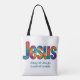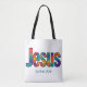 Tote with Beautiful colorful geometric design of the name of "Jesus" loves you (personalize message or scripture or name). Great gift for Christians who love the Lord and are proud to be His. This bag is fun to give for religious celebrations, events and parties such as baptisms and summer BBQ's.