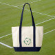 Juego Set Partido, monograma verde, bolsa tote de tenis de ribete navy. Personalice con su inicial. Perfecto para llevar sus artículos esenciales de tenis, como regalo para un amante del tenis o como bolsas de regalo para una fiesta de soltero o despedida de soltera con tema de tenis. Diseñado para combinar con nuestra Colección de Tenis Juego Set Partido.
