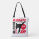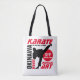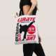 El hombre de karate tocó la bolsa junto al árbol de regalo.