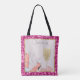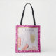 Esta elegante y glamurosa bolsa de personalizado con tote presenta un tema de Lady Gambling con un fondo rosado. Un vaso de chaflán brillante, dados purpurinas rosados y tacones de mujer se retratan en la parte inferior. El marco de un estilo de diamante rosa y dorado bordea la imagen.