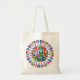 Colorido TOTE BAG GLOBAL PEACE que muestra un globo de banderas mundiales rodeadas de coloridas manos altas gráficas. Esto sería una gran adición o regalo para celebrar la paz mundial internacional.