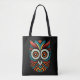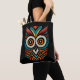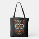 Se trata de un búho decorativo hecho a mano y estilizado con motivos aztecos en tonos negros, rojos, turquesa y naranja.