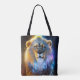 Un ilustracion mágico y fantástico de un león con energía cósmica brillante.