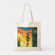 An illustration from a lampposts on Westminster Bridge in London at sunset with the Elizabeth Tower (a.k.a. Big Ben) in the background printed on both sides of a tote bag.