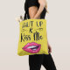Esta bolsa de beso de moda me muestra un dibujo de un par de labios de personalizado magenta y la leyenda "Cállate y besa conmigo" con una letra negra y moderna sobre un fondo amarillo brillante.