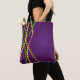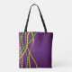 Esta bolsa de tote, cubierta de morado con perlas de Mardi Gras sobre ella, es sólo lo que hay para llevar tus golosinas de desfile.