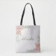 Marfil Salmon Cream Arreglo Floral Bride Tote Bag. Sienta la puesta de sol de verano con este cremoso arreglo salmón de la elegancia nupcial eterna. Los tonos melocotón y naranja se entremezclan en una fascinante cascada de rosas, ranunculus y dahlias, que evocan el romance y la alegría en su día especial. Personalice con su nombre o texto de su elección para que sea tan individual como usted.