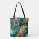 Eleva tu transporte diario con esta impresionante y personalizada bolsa de mano que presenta un diseño abstracto lujoso. La obra de arte imita la belleza orgánica del arte fluido de tinta alcohólica, girando con ricos tonos de azul teal profundo, turquesa y azul aqua, acentuados por elegantes venas de lámina de oro falso y texturas brillantes.