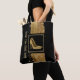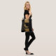 Moda todo propósito a la bolsa hecha en negro, con gráficos de purpurina dorado y trazos de pintura dorada. Una decoración cuadrada negra, en el centro de la bolsa, tiene un elegante par de tacones altos dorados. El texto de Golden tan dice: "Tengan zapatos viajará, y pueden ser personalizados para leer lo que quieran".