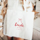 Modern Script Coquette Bow Bride's Name Wedding/Bachelorette Tote Bag. A minimalistic and cute wedding tote bag, designed with "bride" in elegant script lettering. Customize with the bride's name, and your wedding or bachelorette location below.