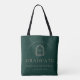 This classic, elegant graduation tote bag features a dusty rose pink monogram initial in open serif font encircled by a vintage line art acanthus crest on a dark green background. Personalize the text with the graduate's name, school and class year. Ideal for high school or college graduation.