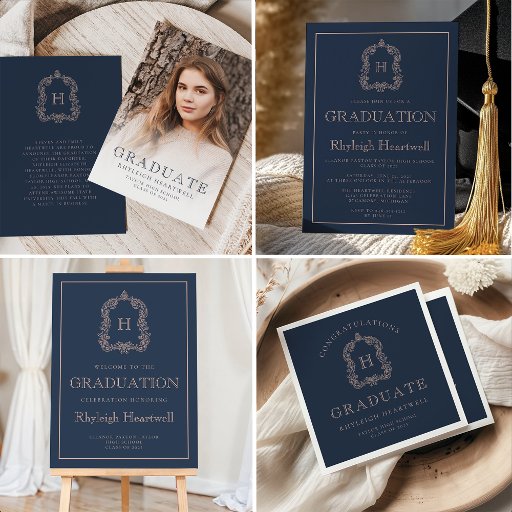 Monogram Crest Navy Rose Gold Graduation SuiteDiseñado por Akhates Designs