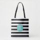 Personalice esta moda bolsa de tote rayada blanca y negra con su monograma inicial en una insignia de círculo acuático turquesa de verano para un tote que sea único suyo! También hace un gran regalo para las damas de honor.