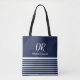 Una elegante, moderna y monogramada bolsa de tote con rayas horizontales azul marino y blanco, personalizada con su nombre e iniciales (estilo letra manuscrita)