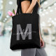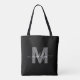 Elegante Personalizado Black Trendy Script Moderno Nombre Monograma Tote Bag. Añade un toque de sofisticación a tu estilo diario con esta bolsa de moda. Este tote, con una inicial gris y elegante centrada en un fondo negro nítido, con un diseño limpio y moderno a ambos lados, combina elegancia y practicidad. Perfecto para llevar lo esencial al trabajo, a la escuela o al día, este tote es ideal para profesionales de negocios, estudiantes o cualquier persona que aprecie accesorios elegantes y funcionales. Es un regalo para cumpleaños, vacaciones, el Día de la Madre o cualquier ocasión especial. Una adición pulida y práctica a sus productos básicos de uso diario.