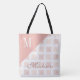 Nuestro bolso de personalizado monogramo de tote está adornado con una suave impresión de damasco rosa y rubor. Personalizar con su nombre e inicial. Ver nuestra línea completa de productos en nuestra tienda Zazzle.