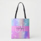 Bolsa de tetas grisona y linda con un colorido color rosa, púrpura, lila, azul y verde corazones de arco iris unicornio brillantemente de fondo. Su nombre personalizado y su monograma están escritos en un guión elegante con letras a mano con un fondo rosado. ¡Un regalo perfecto de cumpleaños o Navidades!
