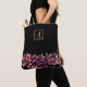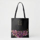 Elegante Bolsa de Tote de Monograma Negro Morado Dorado Floral. 3 flores florecientes con detalles y hojas de color rojo profundo, violeta y dorado se agrupan en un arco suave sobre la parte del amante en la parte delantera. En la parte superior central se encuentra un marco negro y dorado con su letra de monograma y su personalizable de nombre completo. La parte posterior tiene el mismo marco monograma personalizado en dorado. Tener un lado en color sólido con sólo el monograma hace que el tote elegante sea versátil para todas las ocasiones, tanto privadas como en el trabajo. Llegar a cualquier reunión con una apariencia cohesiva y bien pensada para una primera impresión impresionante. Vea la coincidencia de productos con el mismo tema de diseño en la colección. Mezclar y hacer juego.