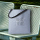 Crea un bolso de personalizado acentuado con tu nombre en blanco sobre un monograma azul oscuro inicial sobre un fondo azul polvoriento. MÁS colores en nuestra colección.