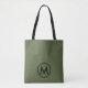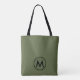 La moderna bolsa de tote monogramada presenta un diseño minimalista con un emblema verde oliva y un monograma negro sobre un fondo de oliva.