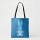 La silueta azul Pascua del conejito personalizó el tote de la caza del huevo de los niños. Silueta azul del conejito con las colas mullidas. Personalice con el nombre de su niño en el centro. Cambie el color del texto eligiendo "personalizar". El fondo es azul. El tote personalizado lindo para el huevo de Pascua caza, trata del conejito de pascua o los niños que aman conejo de conejito diseñan. Diseños elegantes modernos de Pascua para los niños. www.SamAnnDesigns.com