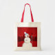 Navidades sacan una bolsa con el ilustracion de un feliz hombre de nieve cantando con un micrófono. La nieve está cayendo, las copas de nieve por todas partes y se puede ver un bosque de pinos en el fondo. Esta feliz bolsa de muñecos de nieve tiene un alegre esquema de color de Navidades blancos y rojos.