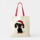 Esta bolsa de tote festiva incluye un encantador dibujo personalizado de un dachshund negro y marrón con un sombrero rojo brillante de Santa. ¡Hace un regalo divertido para los Navidades para las mamás y papás doxie de los perros!