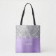Personalizar el guión moderno de estilo manuscrito para crear tu propia bolsa de compra con una impresión completa. Añadir un primer monograma para crear una combinación inicial de nombre. Purpurina de plata de imitación Girly sobre un Relieve metalizado de aspecto metalizado morado de lilo pálido. El Relieve metalizado, los destellos y el purpurina son arte digital que se imprimirá como una foto.