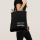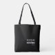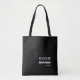 Elegante bolso de tote de personalizado minimalista NEGRO, con texto que lee NOUVEAU MINIMO, que es una mezcla de francés y español, y se traduce vagamente como 'nuevo minimalista' y se refiere a una nueva forma de pensar después de un giro pandémico. Debajo hay un nombre de marcador de posición. Todo el texto es personalizable, por lo que puede cambiar según sea necesario y agregar su propia redacción. El texto está bien justificado. El diseño se repite en la parte posterior. Viene con otros colores.