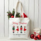 Esta bolsa de petaca contiene un lindo ilustracion de un petcracker, el rey del ratón y la bailarina con el dicho: Feliz Navidad con un tipo de letra roja. Personalízalo con el nombre de su familia y la fecha establecida en la parte delantera y trasera del tote. ¡Un tote perfecto para la temporada de obsequios!