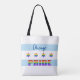 Este diseño Chicago PRIDE combina los elementos de la bandera de Chicago con los colores del arco iris de LBGTQ. La palabra Chicago está en una fuente tipo script azul. Las cuatro estrellas y la palabra "ORGULLO" están en los colores del arcoiris.