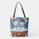 Esta encantadora bolsa de tote tiene dos lindos hombres de nieve con sus mejillas rosadas y narices de zanahoria. Se sientan cómodos en una bañera de hielo, irradiando un aura de camaradería alegre. Lleva un toque de maravilla de invierno adonde vayas y deja que estos encantadores hombres de nieve sean sus compañeros en la helada aventura de la vida.